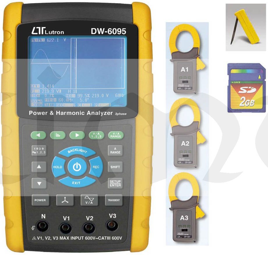 • Měří V, A, kW, kVA, kVAR, PF, kWH, kVAh, kVARh, PFH, úhel fáze, Hz, nevyváženost