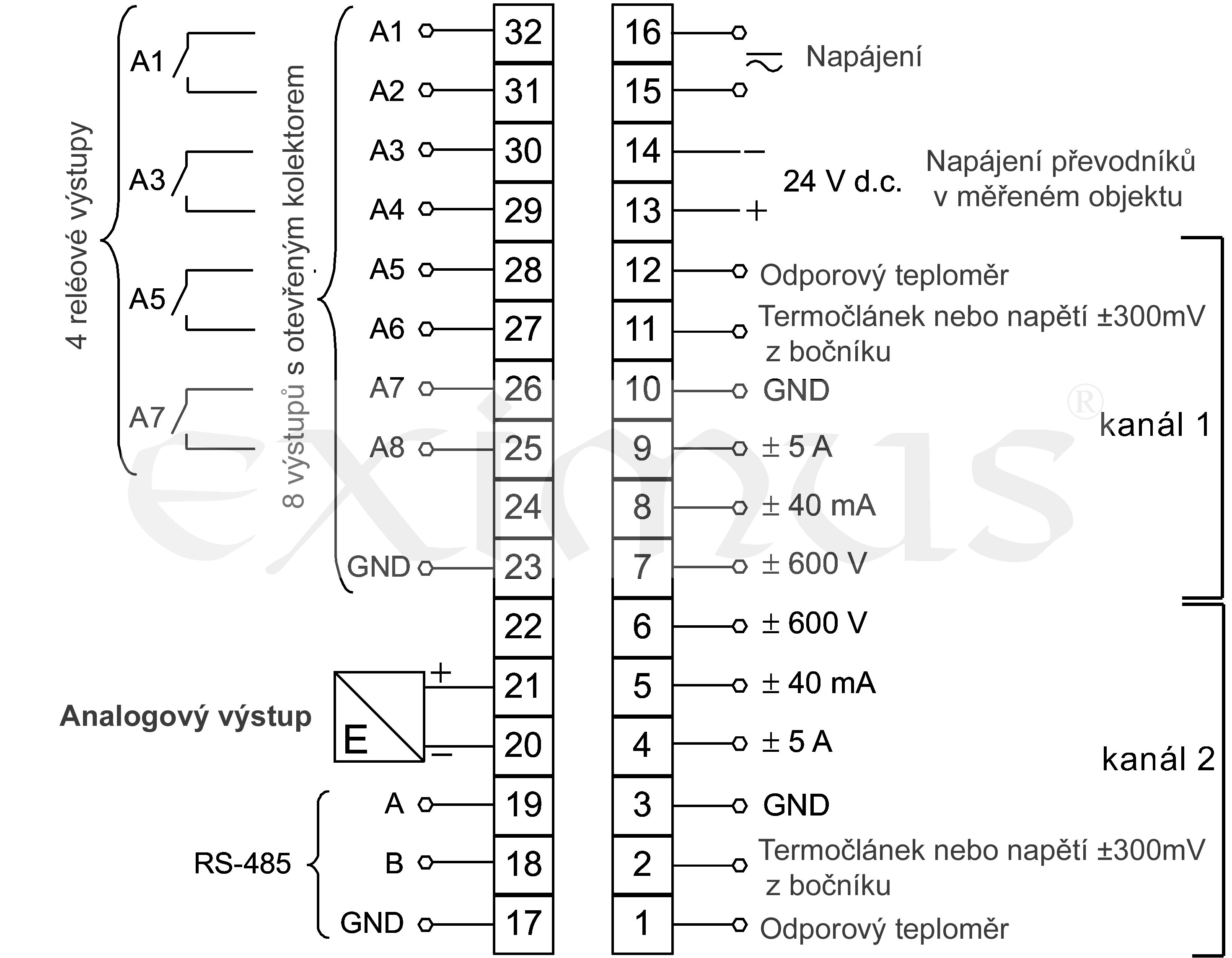Vstup přístroje Pt100, Pt500, Pt1000, Termočlánek J (Fe-CuNi), Termočlánek K (NiCr-NiAl), Termočlánek N, E, R, S, T, Odpor 0..10k ohm, +/- 300 mV dc, +/- 600 V dc, +/- 40 mA dc, +/- 5A dc