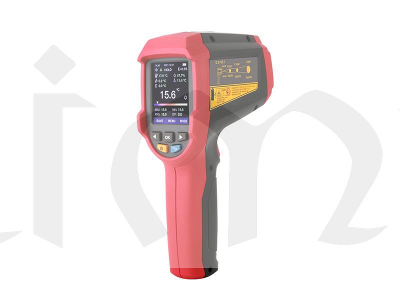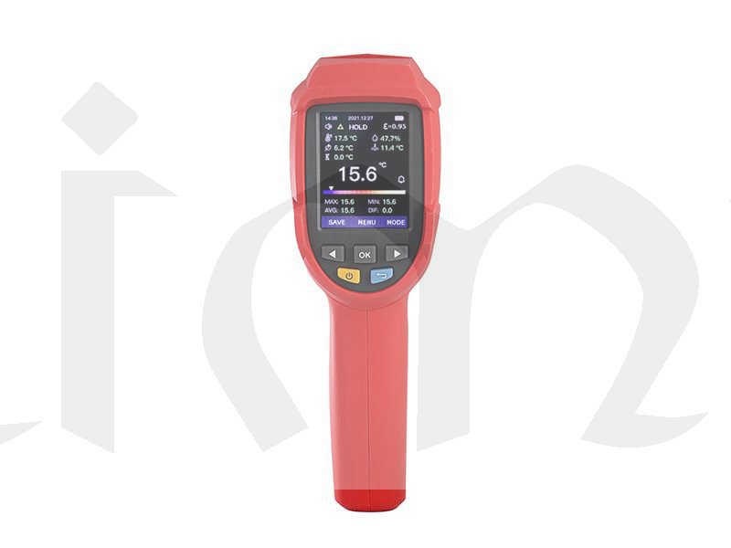 Profesionální bezkontaktní infračervený teploměr UT-305C+ dokáže rychle a přesně určit povrchovou teplotu v rozmezí -50...+2200°C změřením infračervené energie vyzařované z cílového povrchu. Pro snazší a intuitivní zaměření přístroje na cílový povrch je zabudován laser, který indikuje správné zamíření teploměru. Poměr vzdálenosti k průměru měřeného povrchu je u tohoto přístroje 55 : 1. Tento teploměr má zabudované další funkce, např. měření teploty okolí teploměru, měření teploty kontaktním termočlánkem typu K, měření relativní vlhkosti okolí teploměru. Na základě těchto změřených hodnot sám vypočte teplotu rosného bodu nebo teplotu vlhkého teploměru. Do teploměru je možné zadat systémový čas a datum. Měření hodnot je možné naplánovat v předem stanovených intervalech a celkem 999 událostí (skupin dat) uložit do interní paměti. Je možné přednastavit emisivitu měřeného povrchu v rozmezí 0,1 až 1,0. Indikaci přednastavených funkcí a naměřených hodnot zajišťuje jasný a vysoce kontrastní TFT LCD barevný displej a hraniční hodnoty jsou indikovány bzučákem a na displeji. Je možná indikace minimálních, maximálních a průměrných teplot a odchylek od průměru ( MIN, MAX, AVG, DIF ). Přístroj je odolný proti pádu z výšky 1 metru.
