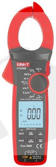 Digitální klešťový měřič UT 208B slouží pro měření střídavých a stejnosměrných napětí do 1000V, AC a DC proudů do 1000A a frekvece u nízkého napětí (nn) do 1000V a proudu do 1000A v rozmezí 40Hz až 400Hz a u malého napětí (mn) 10Hz až 1MHz. Na všech rozsazích má ochranu před větším napětím než 1000V a zvukový a optický alarm. Čtyřmístný více segmentový displej o rozměru 43 x 45 mm se zadním podsvícením a rychlou obnovovací frekvencí (3krát/s). Maximální zobrazitelná hodnota je 6000. Displej obsahuje analogovou 31 dílkovou stupnici (bar graf). Rozevření čelistí umožňuje měření na kabelech o průměru až 42mm. Bezkontaktní snímání elektrického pole (NCV) umožňuje detekovat vodiče pod napětím. Přiložená sonda - kryt hrotů na testovacích kabelech umožňuje měření na rozvodech nn v kategorii CAT III bez nebezpečí vzniku oblouku. Bez krytů na hrotech lze měřit testovacími kabely jen na rozvodech nn kategorie CAT II (například zásuvky 230V). S přiloženým termočlánkem typu K (teplotní senzor niklchrom - niklkřemík) umožňuje měření teploty od -40°C do 1000°C. Snímačem je citlivá Hallova sonda. Možnost dokoupení pružné smyčky pro měření proudů až do 3000A. Napájecí baterie 3ks 1,5V R03. Příkon měřiče je cca 1,8 mA. Přístroj má funkci automatické úspory energie - po 15ti minutách přechází do režimu spánku, kdy má spotřebu jen <50μA, což účinně prodlužuje životnost baterie. Funkci úspory energie lze vypnout.