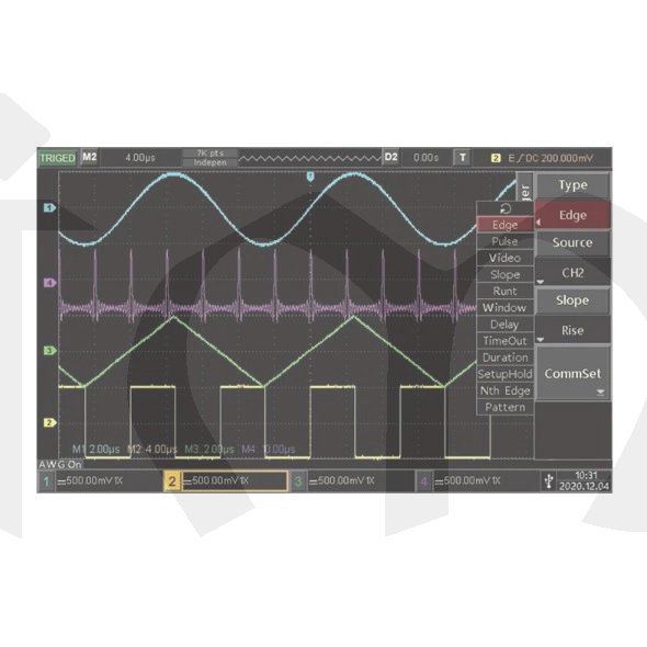 - spouštění: Edge, Pulse, Video (PAL, SECAM, NTSC), Slope, Alternating trigger