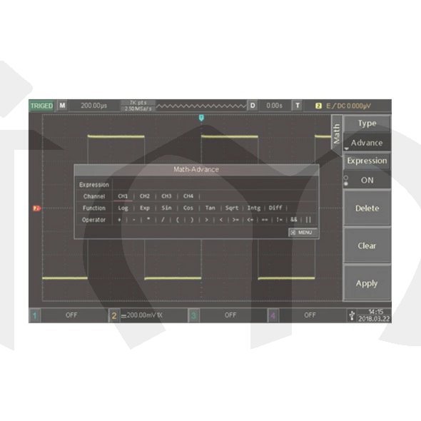- matematické operace se vstupními signály: A+B, A-B, AxB, A/B, FFT, Editable Advanced, Filter