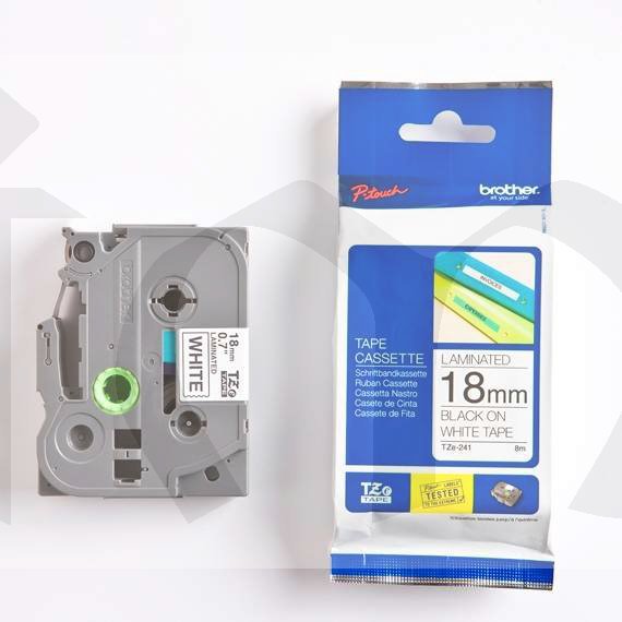 P-9100 - Páska TZ-241 do tiskárny čárových kódů, šířka 18 mm, délka 8 m. Černý tisk na bílé pozadí, laminovaný.