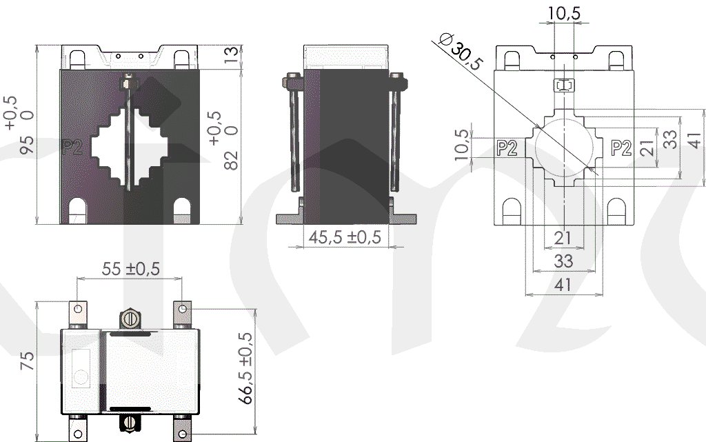 Počet a poloha primárních vodičů (měděný pas) je dána velikostí primárního proudu (IN≤800 A vodorovně, IN>800A svisle).