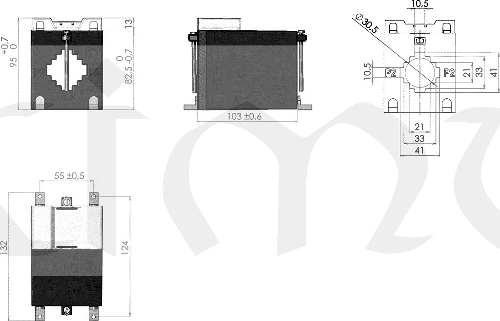 Počet a poloha primárních vodičů (měděný pas) je dána velikostí primárního proudu (IN≤1000 A vodorovně, IN>1000A svisle).