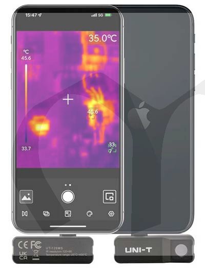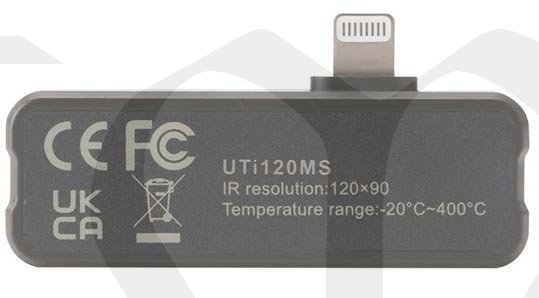 Termokamera UTi-120 Mobile je kamera pracující v oblasti infračerveného záření, určená pro měření povrchové teploty objektů v rozmezí od -20°C do +200°C. Kamera je určena pro připojení k iPhonu, vybavenému zásuvkou pro konektor typu lightning. Je však možné kameru propojit s telefonem i přiloženými prodlužovacími kabely. Na displeji mobilního telefonu můžete zobrazit tepelný obraz objektů, převedený do viditelného obrazu se zvolenou barevnou paletou: železná červená, duha, stupnice šedé, horká červená, černo bílá, láva, vysoce kontrastní duha. V reálném čase je možné nechat v obraze vyznačit místa s minimální i maximální teplotou s údajem ve stupních Celsia nebo Fahrenheita. Možnost nastavení alarmů při překročení určité teploty. Obraz z této kamery je možné prolínat (PIP) s obrazem přední nebo zadní kamery mobilního telefonu, přičemž současně lze infračervený obraz zrcadlit. Je možné analyzovat teplotu v bodě nebo vyznačené oblasti (obdélníku, kruhu, čáře apod.) měřeného objektu. Automatické nebo ruční spouštění uzávěrky fotoaparátu, uložení fotek nebo videí. Možnost úpravy fotek v aplikaci UTi120 Mobile App.