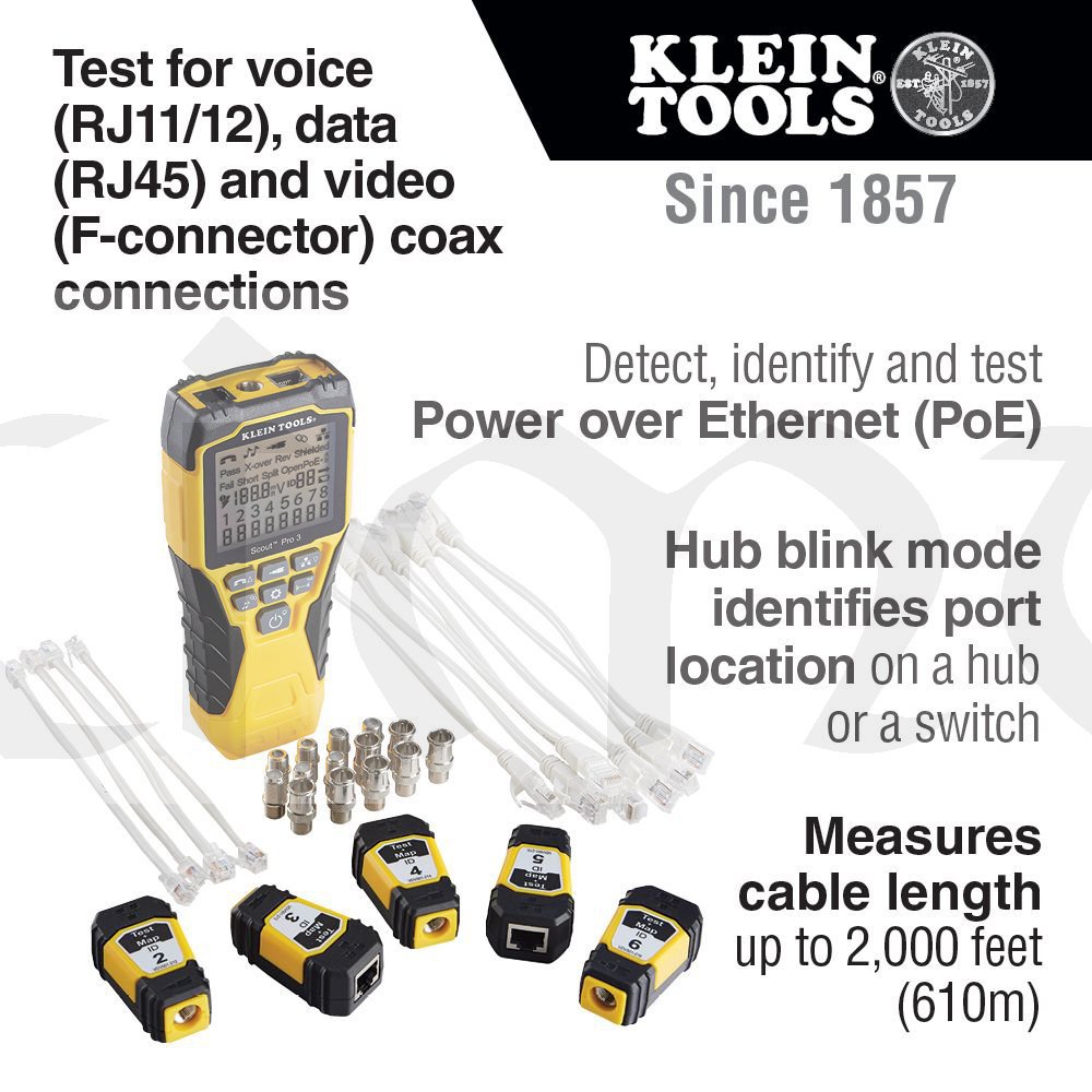 Nový model LAN TESTER - VDV Scout® Pro 3 Tester Kit Locator Map™ (PoE) - KLEIN TOOLS