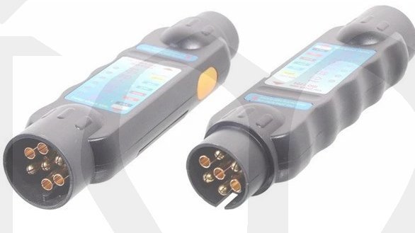 Praktický tester 7 pólových zásuvek i vidlic přívěsných vozíků, karavanů i tažných vozidel. Napájení 12V.