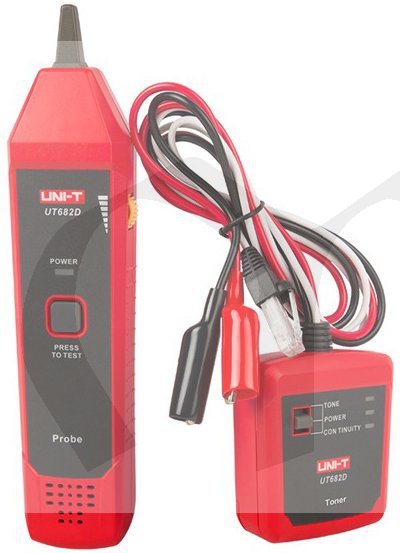 UT 682D - tester kabelů nabízí jednoduchý způsob, jak rychle najít a identifikovat kabely, dráty a svazky kabelů. Připojte přístroj ke kabelu a poté sledujte kabel a signál s pomocí sondy. Přístroj také může být použito k testování spojitosti vedení a polarity na telefonních linkách.