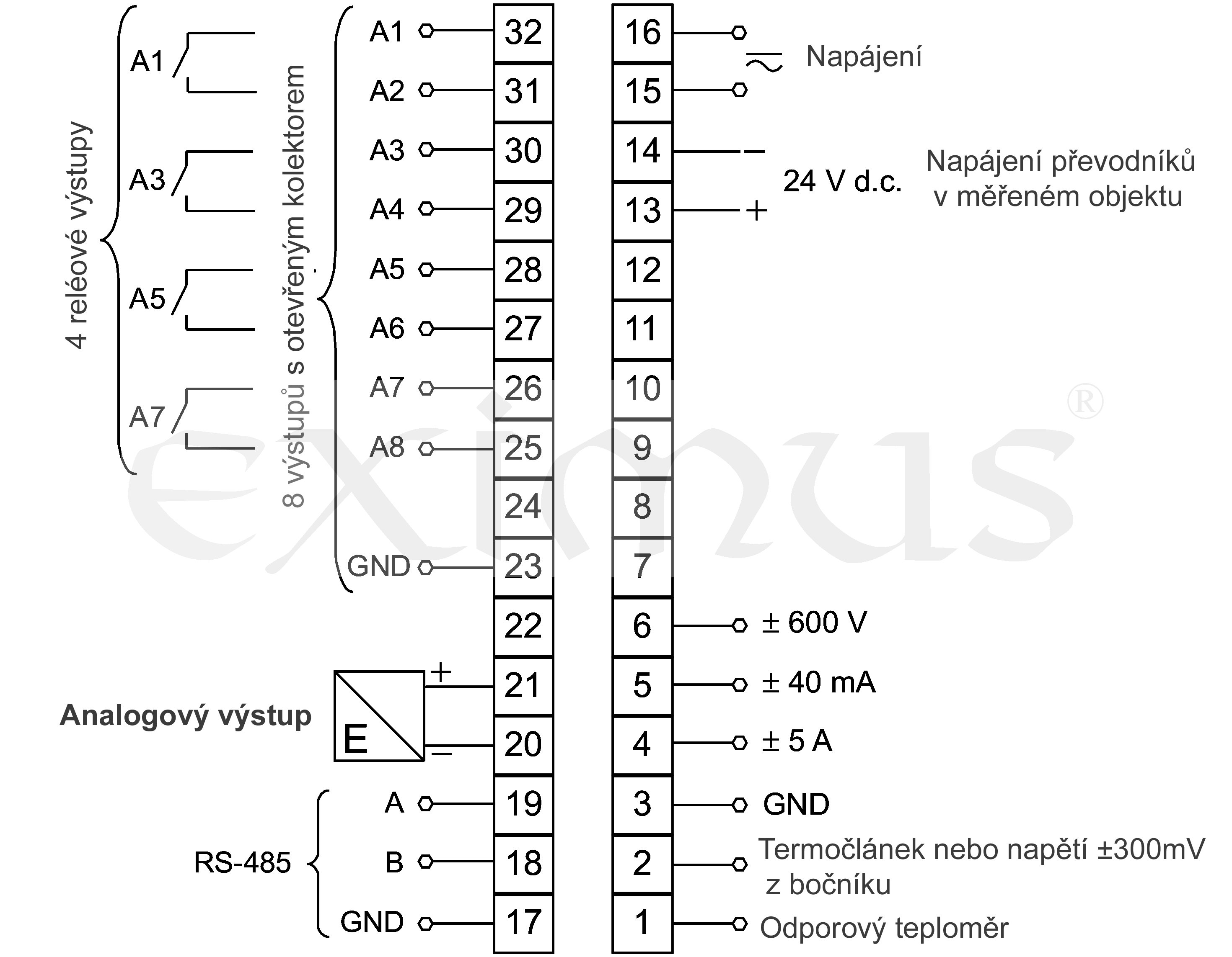 Vstup přístroje Pt100, Pt500, Pt1000, Termočlánek J (Fe-CuNi), Termočlánek K (NiCr-NiAl), Termočlánek N, E, R, S, T, Odpor 0..10k ohm, +/- 300 mV dc, +/- 600 V dc, +/- 40 mA dc, +/- 5A dc