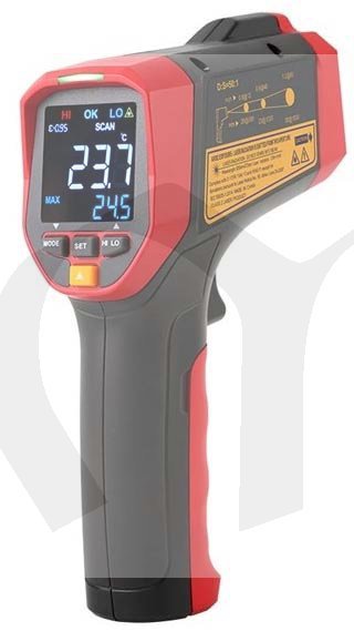 Profesionální bezkontaktní infračervený teploměr UT-305S dokáže rychle a přesně určit povrchovou teplotu v rozmezí -50°C až +2000°C změřením infračervené energie vyzařované z cílového povrchu. Pro snazší a intuitivní zaměření přístroje na cílový povrch je zabudován prstencový laser, který indikuje správné zaměření teploměru. Poměr vzdálenosti k průměru měřeného povrchu je u tohoto přístroje 50 :1. Tento teploměr je odolný proti pádu z výšky 1 metru. Je možné přednastavit emisivitu měřeného povrchu v rozmezí 0,1 až 1,0. Indikaci přednastavených funkcí a naměřených hodnot zajišťuje jasný a vysoce kontrastní EBTN barevný displej a hraniční hodnoty jsou indikovány bzučákem a na displeji. Je možná indikace minimálních, maximálních a průměrných teplot a odchylek od průměru ( MIN, MAX, AVG, DIF ). Teploměr se automaticky vypíná, kvůli snížení spotřeby, pokud je bez použití po dobu 15 s v režimu HOLD a po 10 s v ostatních režimech. Doba změření teploty je v 95% případů do 250msec.