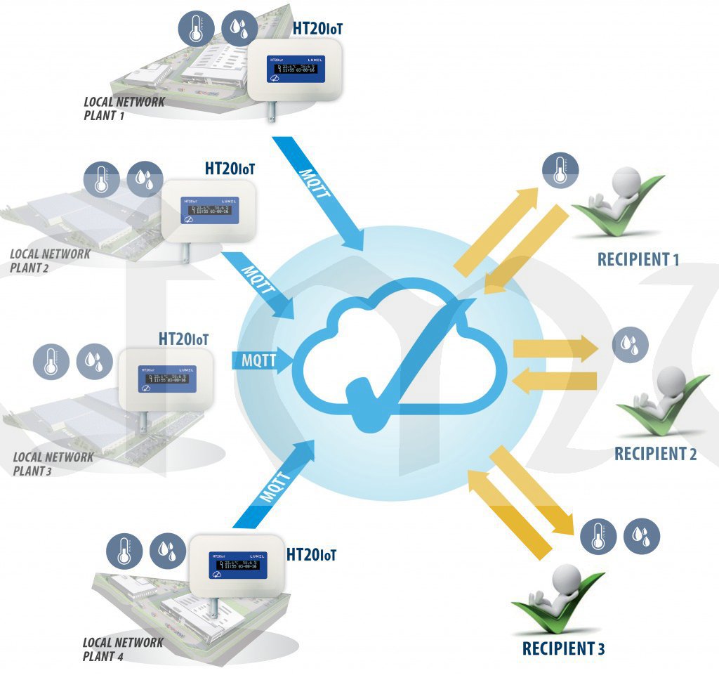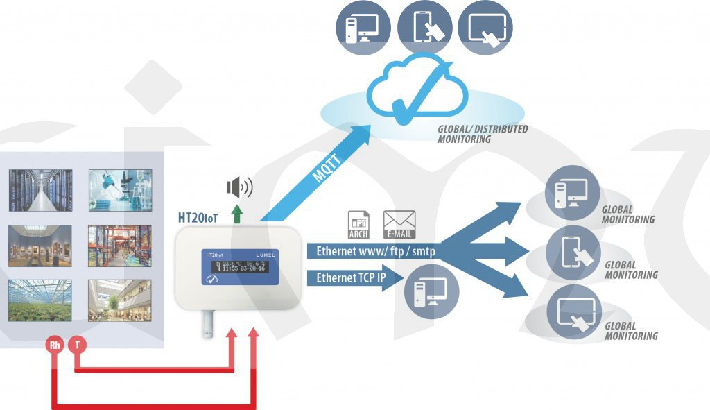 Data zaznamenaná přístrojem HT20-IoT se ukládají do vnitřní paměti a poté se digitálně odesílají uživateli (pomocí Ethernet MQTT).