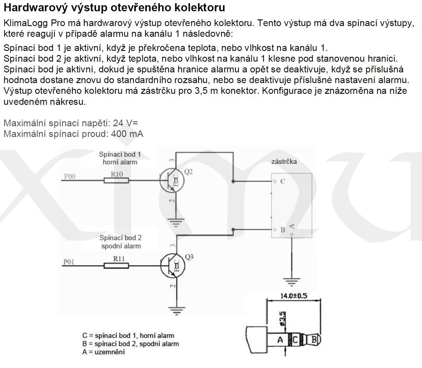 Výstup na konektor jack3.5, spínání otevřeným kolektorem do 24V/400mAdc, maximální a minimálního alarmu na kanálu jedna teploty nebo vlhkosti.