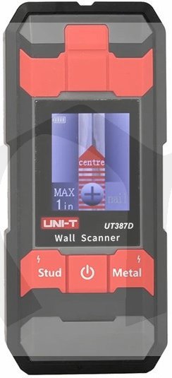 Skener UT-387D je určený pro detekci různých nehomogenit ve zdi nebo za sádrokartonovou stěnou - například železných a neželezných (měděných, mosazných) trubek, výztuže v betonu, nerezová nemagnetická ocel, elektrických drátů bez napětí i s el. AC napětím, dřevěných latí a špalíčků. Detekce probíhá na základě principů elektromagnetické indukce. Skener obsahuje barevný indikační displej s úhlopříčkou 1,8", který zobrazuje nastavené režimy práce a přibližnou hloubku předmětů. Další specifikace předmětů je hlasová (v angličtině). Napájení skeneru je provedeno nabíjecím Li-Ion akumulátorem 3,7V/300mAh, který má životnost přibližně 3000 nabití a vybití.