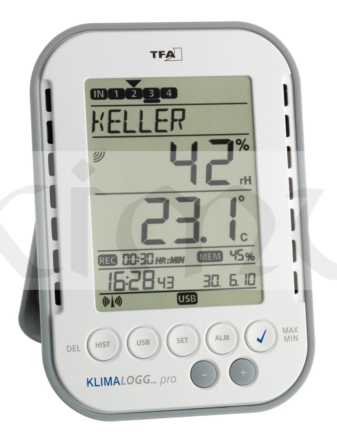 Teploměr s vlhkoměrem "TFA 30.3039" připojitelný do PC přes USB bezdrátový přijímač (velikost USB flash paměti, viz. obrázek níže) zaznamenává vnitřní teplotu a vlhkost, zobrazuje rosný bod, max. a min. naměřené hodnoty s časem a datem měření, průměrné hodnoty. Unikátní funkcí jsou pak alarmy pro dolní a horní mez měřených veličin (teplota, vlhkost). Přístroj má zabudovanou paměť až pro 50 000 naměřených hodnot, které si můžete nechat zobrazit přes displej (mnohem lépe se však data budou zpracovávat v PC).