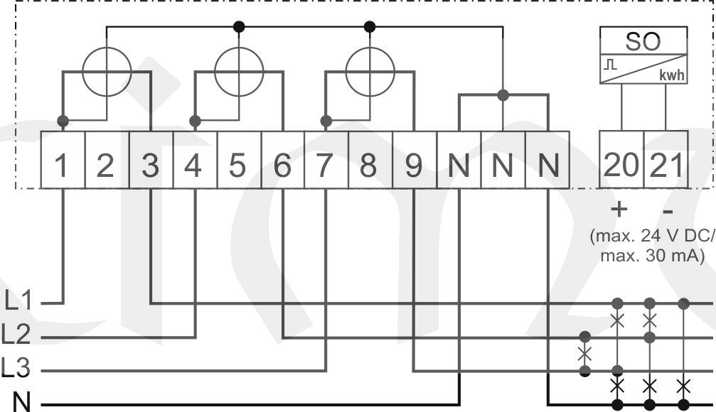 - impulsní výstup SO+LED 1600 imp./kWh (24V/30mA)