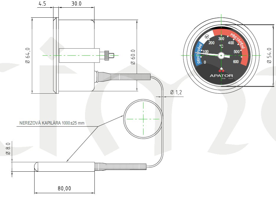 Kapilární teploměr spalin TKS je určen pro přímé měření teploty spalin v kouřovodu krbových vložek a dalších topných zařízení, u kterých není ke kouřovodu přímý přístup. Teploměry mají teplotní rozsah 0..+600°C.