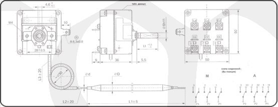 Po dosažení přednastavené teploty termostat automaticky přeruší elektrický obvod, v případě poklesu teploty znovu sepne a soustavně udržuje teplotu media přepínaním poloh zapnuto / vypnuto. Tyto termostaty jsou použitelné zejména pro pračky, průmyslové kuchyňské sporáky, trouby atd. Je vhodný pro kontrolu teploty tekutých a plynných nebo pevných látek.