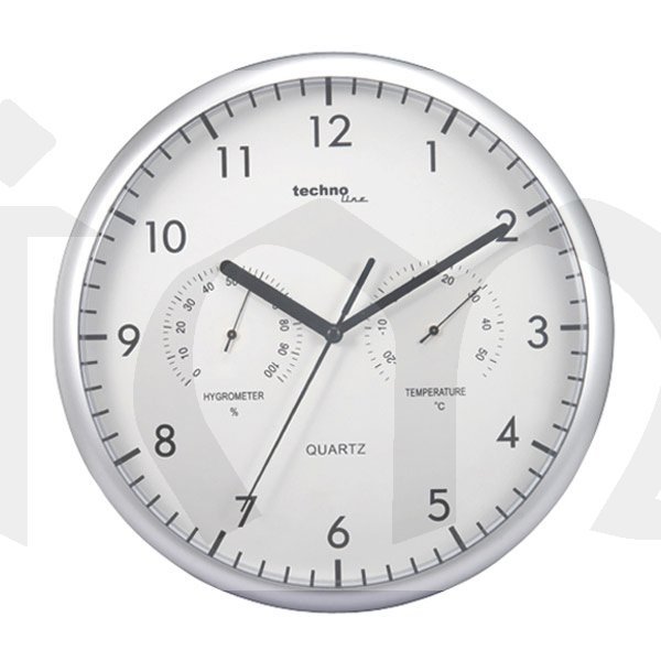 Hodiny analogové s teploměrem a vlhkoměrem plast - Hodiny Quartz - Vnitřní teplota ve °C - Vlhkoměr v % - Velikost: 26,3 cm - Napájení: 1 x AA/ LR06 - Barva: stříbrná