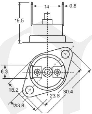 Teplotní pojistka, Switch-off, vertical faston,fastony 6.3 kolmo, rozpínací kontakt, +100°C±3%, IP4X, s manuálním resetem, tlačítko mezi fastonyznovunahození je možné při poklesu teploty pod +95°C